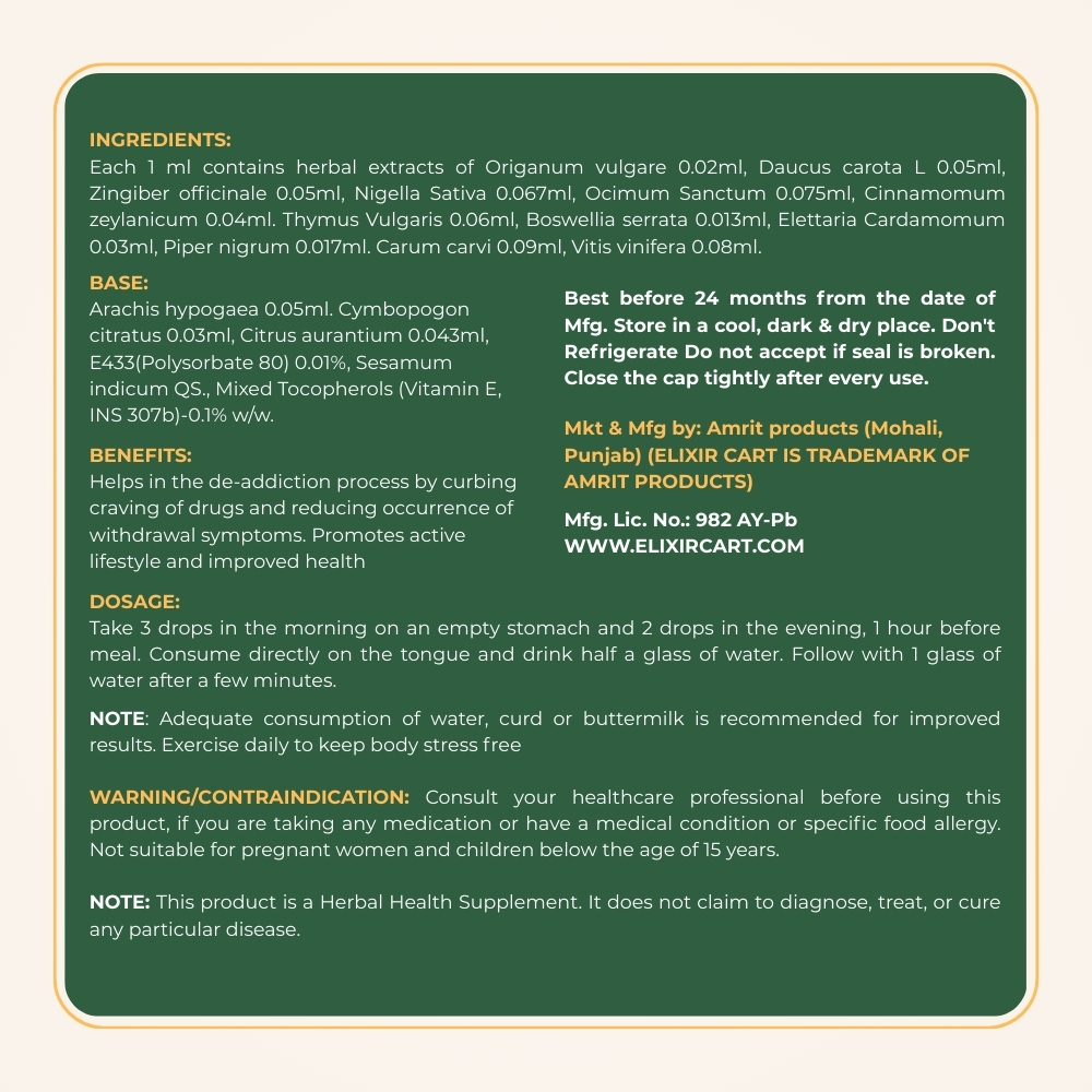 Each 1 ml contains herbal extracts of Origanum vulgare 0.02ml, Daucus carota L 0.05ml, Zingiber officinale 0.05ml, Nigella Sativa 0.067ml, Ocimum Sanctum 0.075ml, Cinnamomum zeylanicum 0.04ml. Thymus Vulgaris 0.06ml, Boswellia serrata 0.013ml, Elettaria Cardamomum 0.03ml, Piper nigrum 0.017ml. Carum carvi 0.09ml, Vitis vinifera 0.08ml.