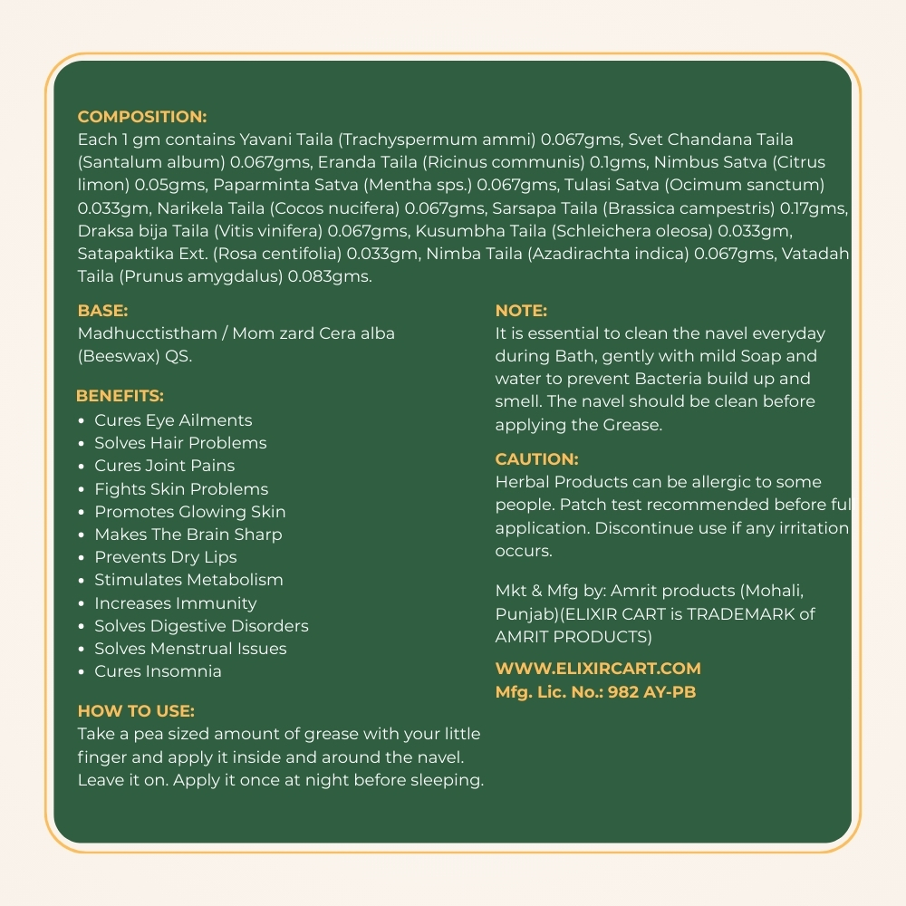 Each 1 gm contains Yavani Taila (Trachyspermum ammi) 0.067gms, Svet Chandana Taila (Santalum album) 0.067gms, Eranda Taila (Ricinus communis) 0.1gms, Nimbus Satva (Citrus limon) 0.05gms, Paparminta Satva (Mentha sps.) 0.067gms, Tulasi Satva (Ocimum sanctum) 0.033gm, Narikela Taila (Cocos nucifera) 0.067gms, Sarsapa Taila (Brassica campestris) 0.17gms, Draksa bija Taila (Vitis vinifera) 0.067gms, Kusumbha Taila (Schleichera oleosa) 0.033gm, Satapaktika Ext. (Rosa centifolia) 0.033gm, Nimba Taila (Azadirachta indica) 0.067gms, Vatadah Taila (Prunus amygdalus) 0.083gms.