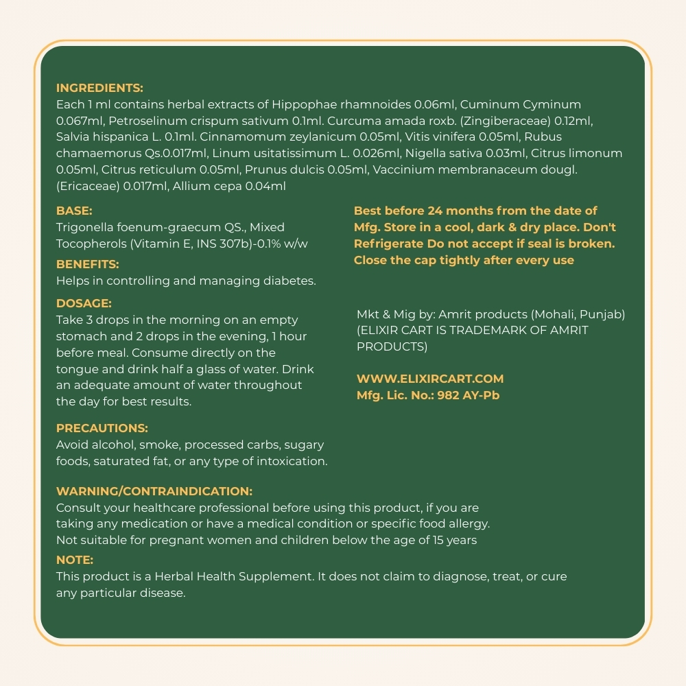 Each 1 ml contains herbal extracts of Hippophae rhamnoides 0.06ml, Cuminum Cyminum 0.067ml, Petroselinum crispum sativum 0.1ml. Curcuma amada roxb. (Zingiberaceae) 0.12ml, Salvia hispanica L. 0.1ml. Cinnamomum zeylanicum 0.05ml, Vitis vinifera 0.05ml, Rubus chamaemorus Qs.0.017ml, Linum usitatissimum L. 0.026ml, Nigella sativa 0.03ml, Citrus limonum 0.05ml, Citrus reticulum 0.05ml, Prunus dulcis 0.05ml, Vaccinium membranaceum dougl. (Ericaceae) 0.017ml, Allium cepa 0.04ml