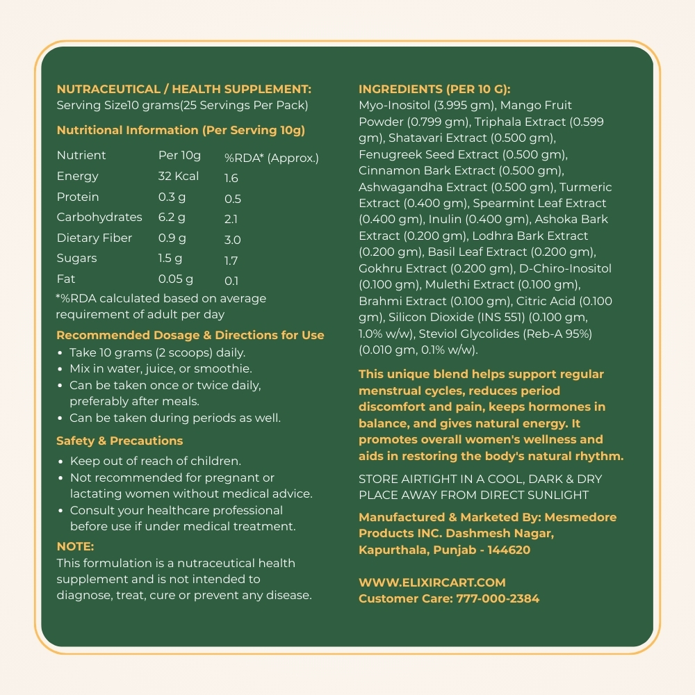 Myo-Inositol (3.995 gm), Mango Fruit Powder (0.799 gm), Triphala Extract (0.599 gm), Shatavari Extract (0.500 gm), Fenugreek Seed Extract (0.500 gm), Cinnamon Bark Extract (0.500 gm), Ashwagandha Extract (0.500 gm), Turmeric Extract (0.400 gm), Spearmint Leaf Extract (0.400 gm), Inulin (0.400 gm), Ashoka Bark Extract (0.200 gm), Lodhra Bark Extract (0.200 gm), Basil Leaf Extract (0.200 gm), Gokhru Extract (0.200 gm), D-Chiro-Inositol (0.100 gm), Mulethi Extract (0.100 gm), Brahmi Extract (0.100 gm), Citric Acid (0.100 gm), Silicon Dioxide (INS 551) (0.100 gm, 1.0% w/w), Steviol Glycolides (Reb-A 95%) (0.010 gm, 0.1% w/w).
