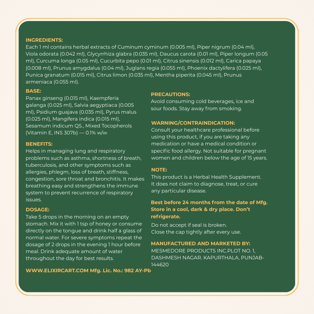 Helps in managing lung and respiratory problems such as asthma, shortness of breath, tuberculosis, and other symptoms such as allergies, phlegm, loss of breath, stiffness, congestion, sore throat and bronchitis. It makes breathing easy and strengthens the immune system to prevent recurrence of respiratory issues.