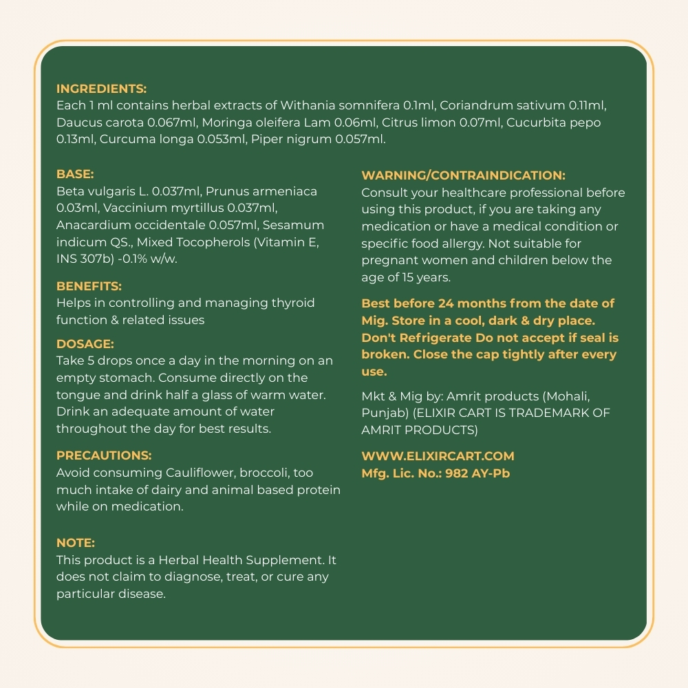 Each 1 ml contains herbal extracts of Withania somnifera 0.1ml, Coriandrum sativum 0.11ml, Daucus carota 0.067ml, Moringa oleifera Lam 0.06ml, Citrus limon 0.07ml, Cucurbita pepo 0.13ml, Curcuma longa 0.053ml, Piper nigrum 0.057ml.