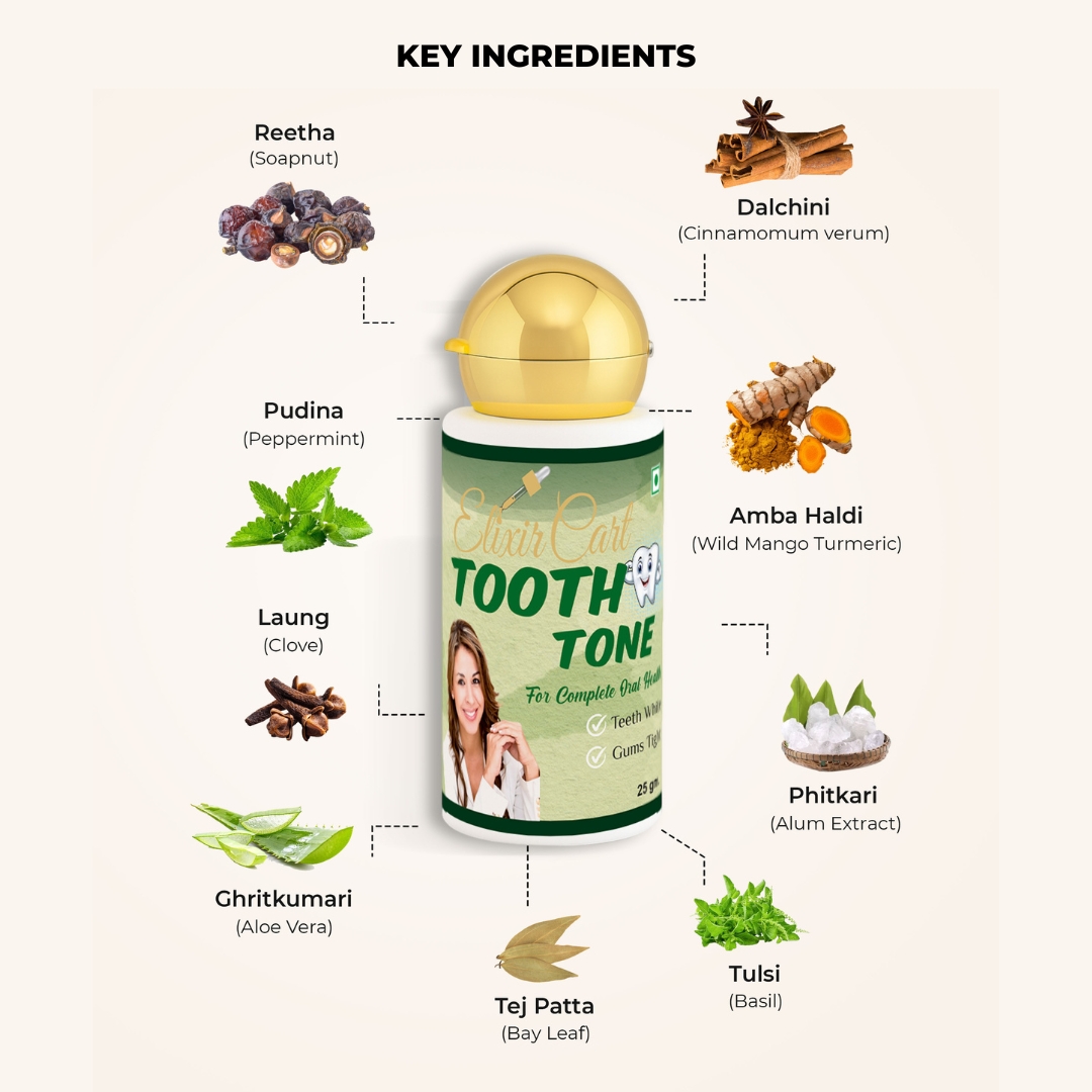 Clean the teeth plainly with a toothbrush at night before sleep and then pour tooth tonic powder on index finger and massage the teeth and gums gently for 1−2 mins. Rinse only once with plain water. Do not eat or drink anything afterwards. Let the product do its work overnight. Use once daily for best results. For severe symptoms, the powder can be used twice a day.