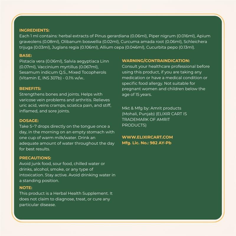 Each 1 ml contains: herbal extracts of Pinus gerardiana (0.06ml), Piper nigrum (0.016ml), Apium graveolens (0.08ml), Olibanum boswellia (0.02ml), Curcuma amada root (0.06ml), Schleichera trijuga (0.03ml), Juglans regia (0.106ml), Allium cepa (0.046ml), Cucurbita pepo (0.13ml).